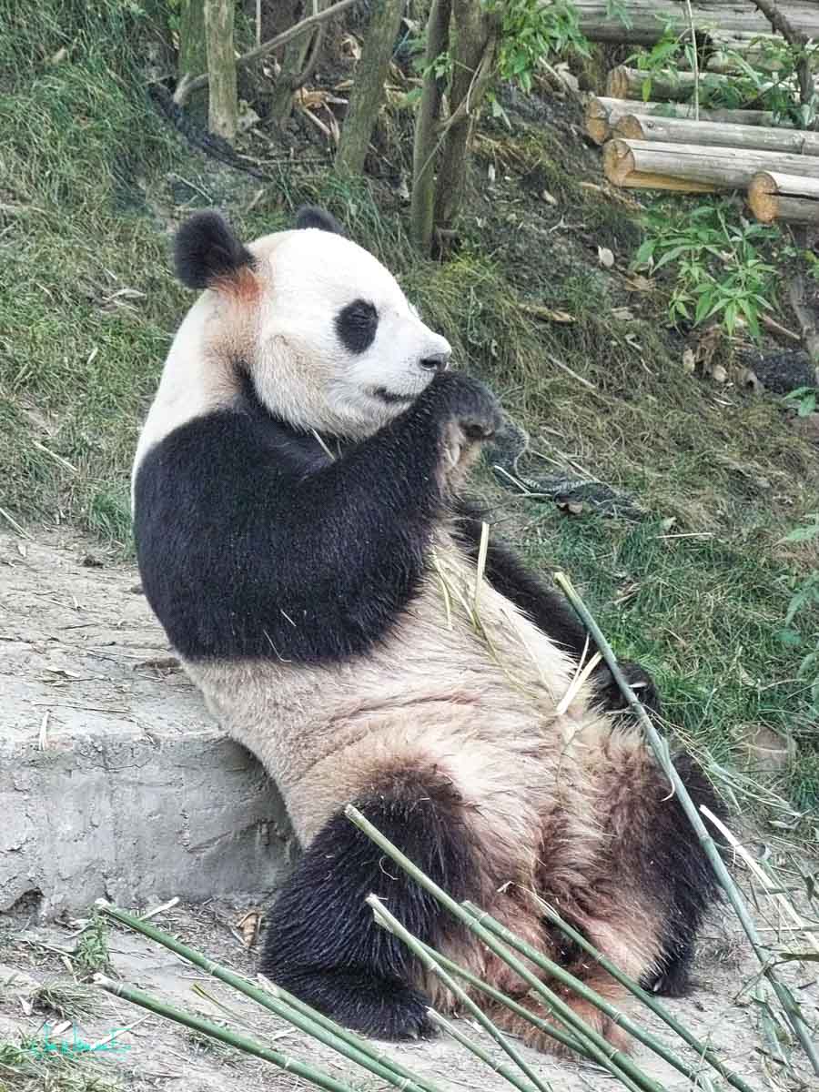 When eating, pandas have this favourite position, sitting or reclining on their back, enjoying their favourite food.