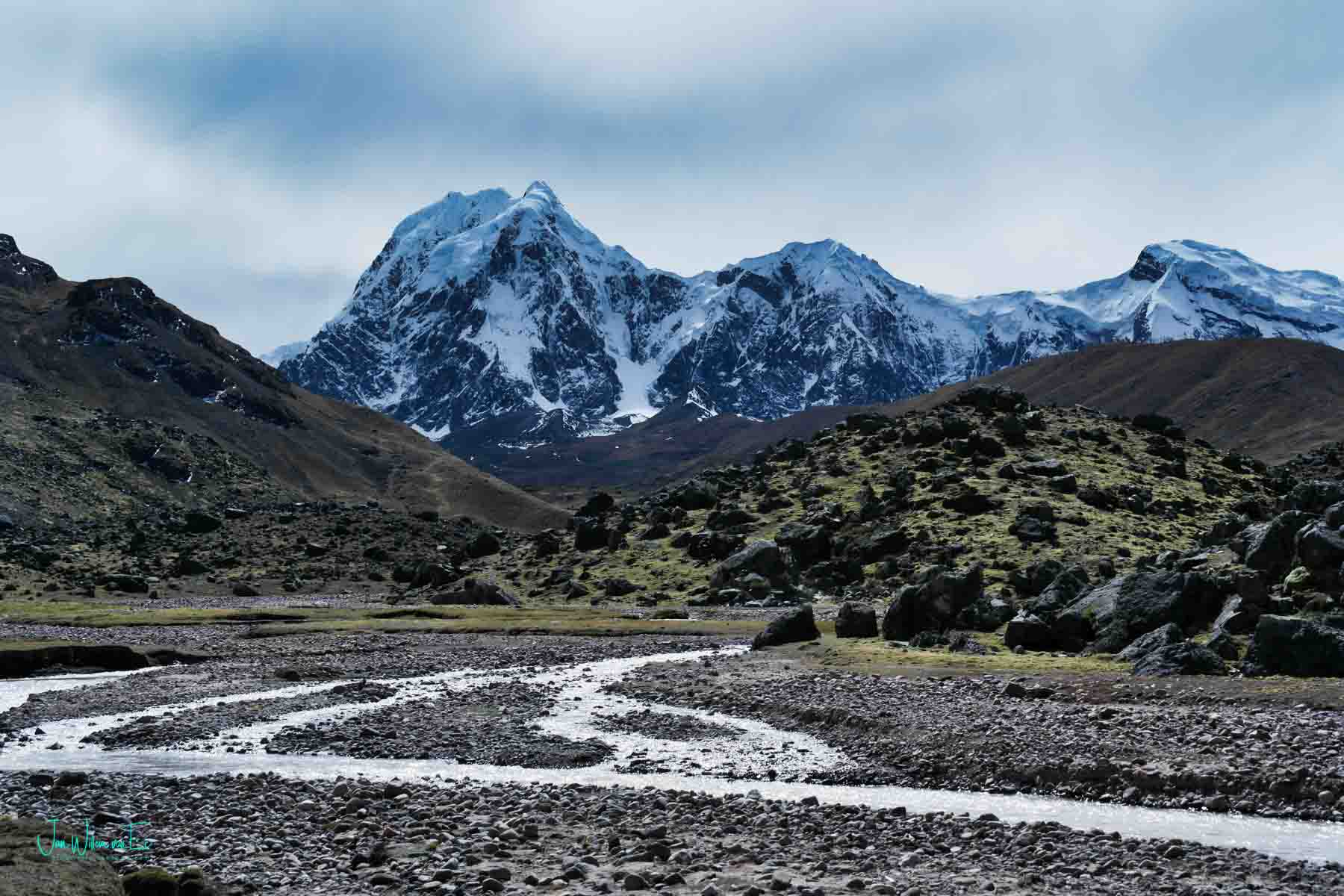 Everywhere small streams cross the valley and before is the V of the hills where the path turns left going up to the Qampa pass